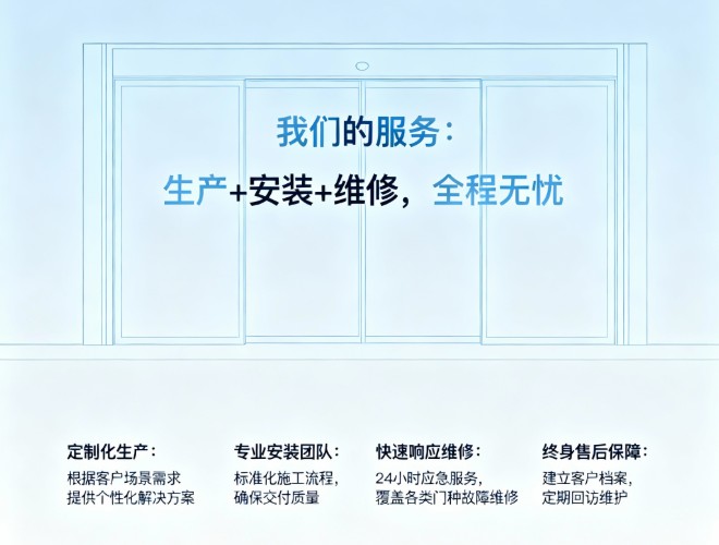 根据客户场景需求提供个性化解决方案,标准化施工流程,确保交付质量 ,24小时应急服务,覆盖各类门种故障维修,终身售后保障,‌建立客户档案,定期回访维护
